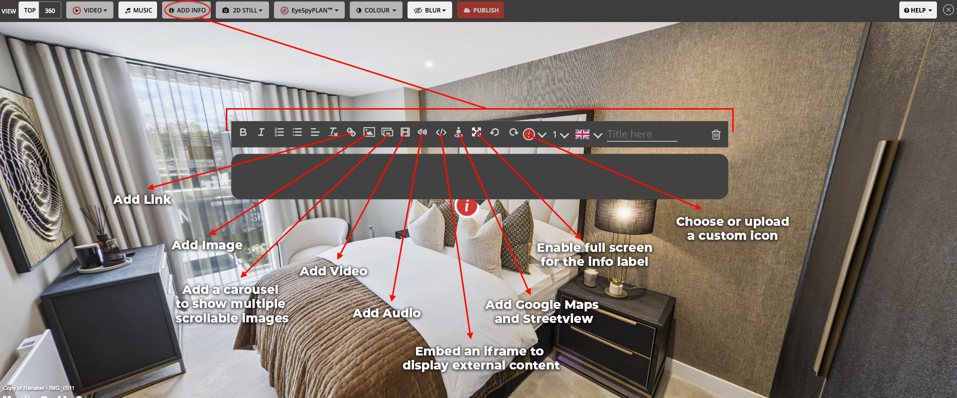 5. You can now add text, images, video, audio, Google Maps and Street View to your info label and choose or upload your own icon.