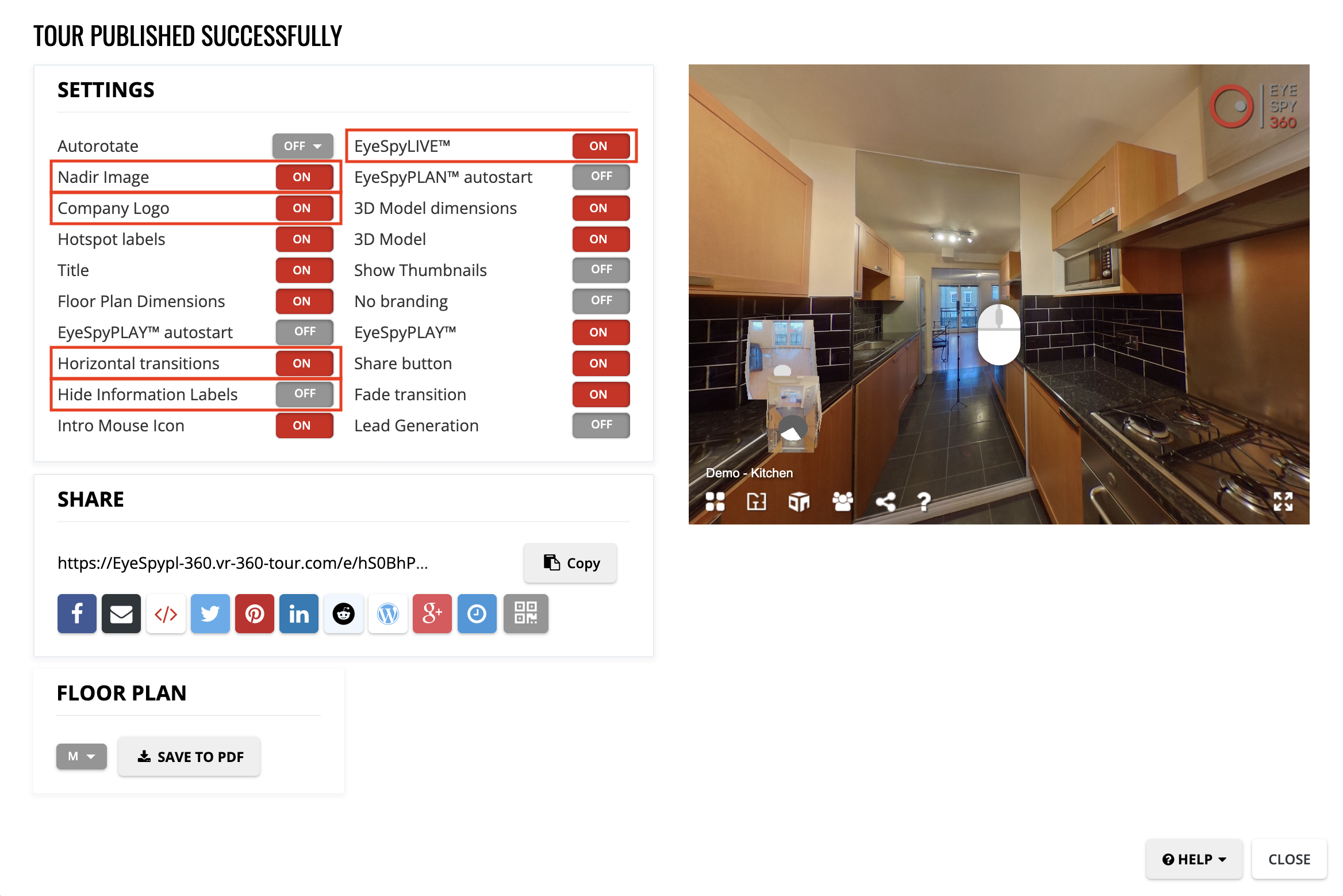 4. Once you have made these adjustments to your Settings, copy your tour's modified URL under the Share heading. Your tour URL should appear in the following format: