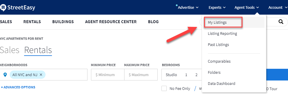 2. Hover over the Agent Tools header and then click My Listings from the drop down menu.